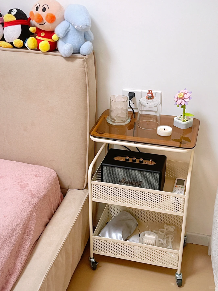 那不妨利用收纳架来当做床头柜,满足年轻人的使用需求,日常存放一些零食和睡前的小玩意儿超好用,拿取也较为方便。