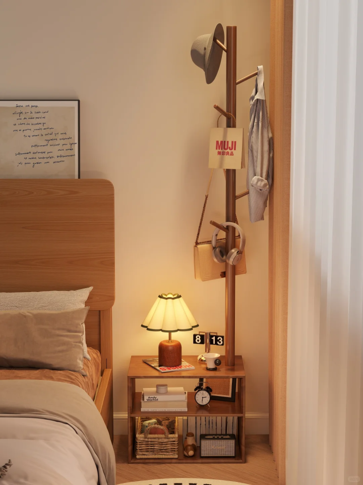 那不妨利用床头柜来增加一组衣架的收纳功能,日常换下的次净衣服统统可以挂在衣架上,防止出现褶皱,影响第2天的穿着。