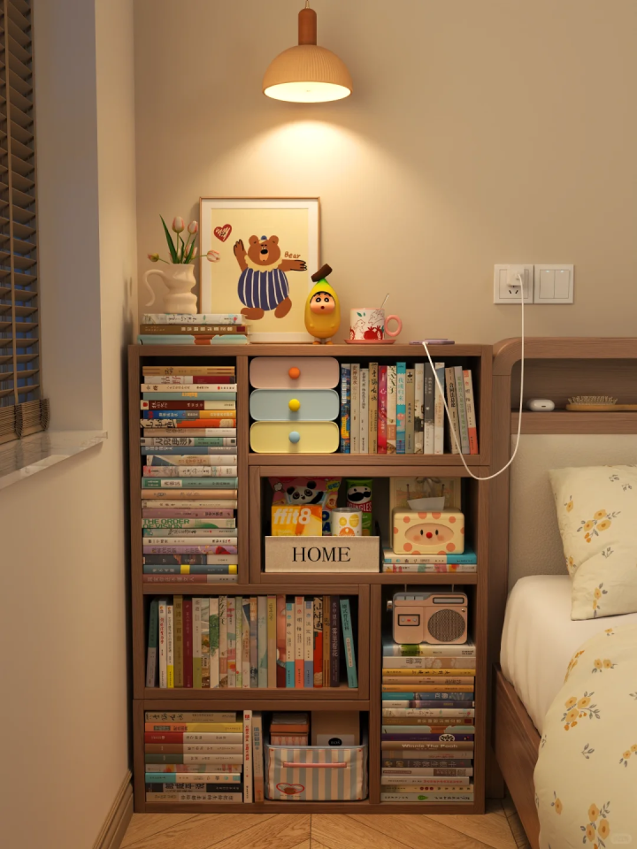 晚上喜欢在睡前看一本书的小伙伴不妨利用书架来当做床头柜,这样既可以收纳书籍,同时也能满足对于床头柜的使用需求。
