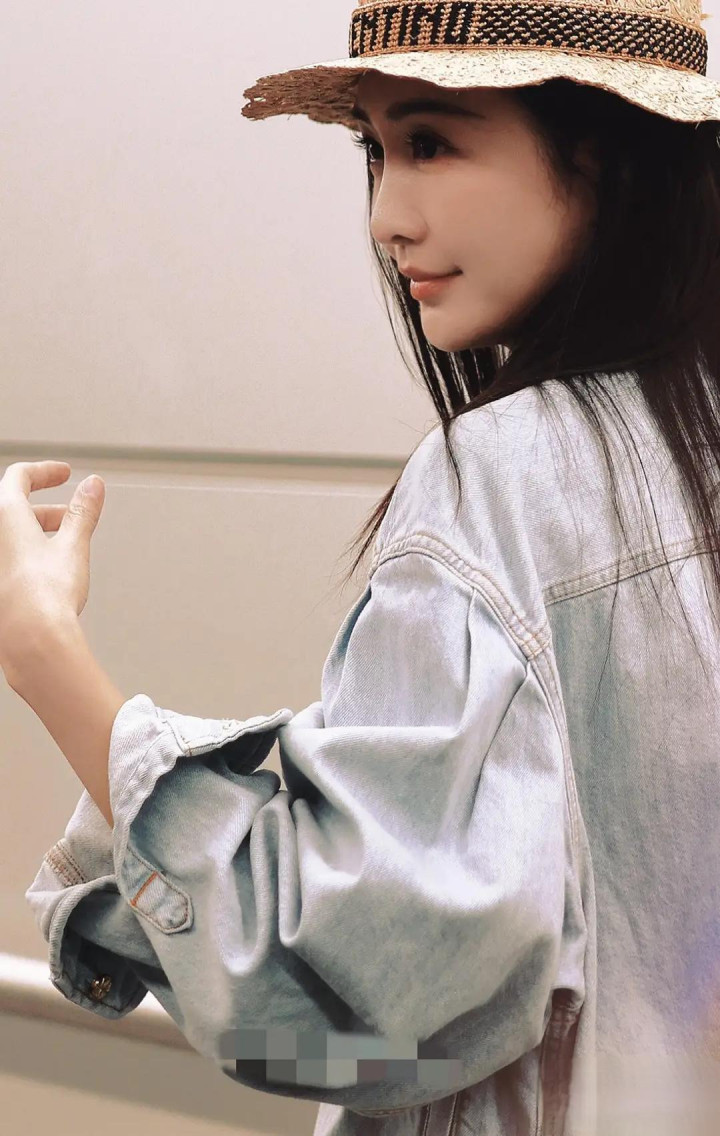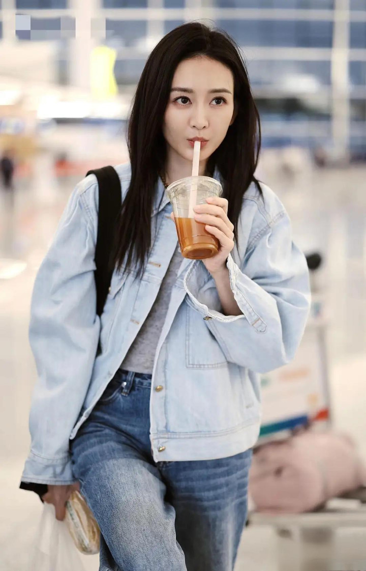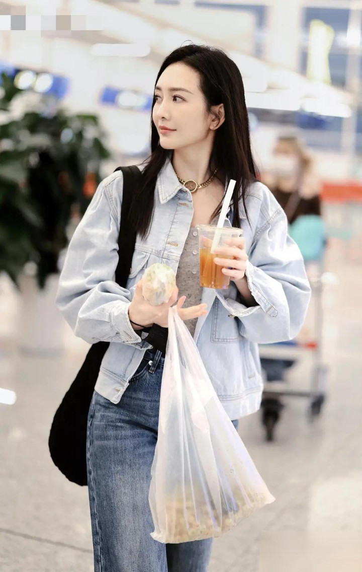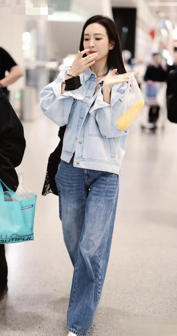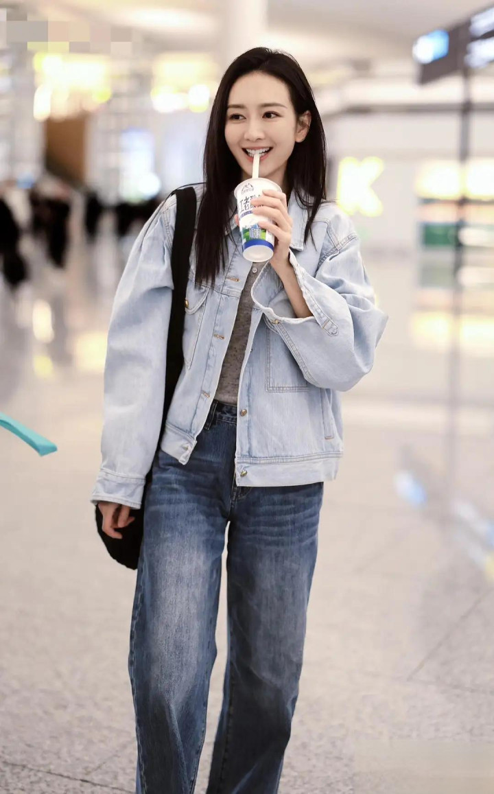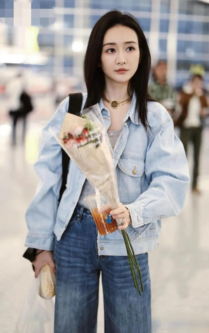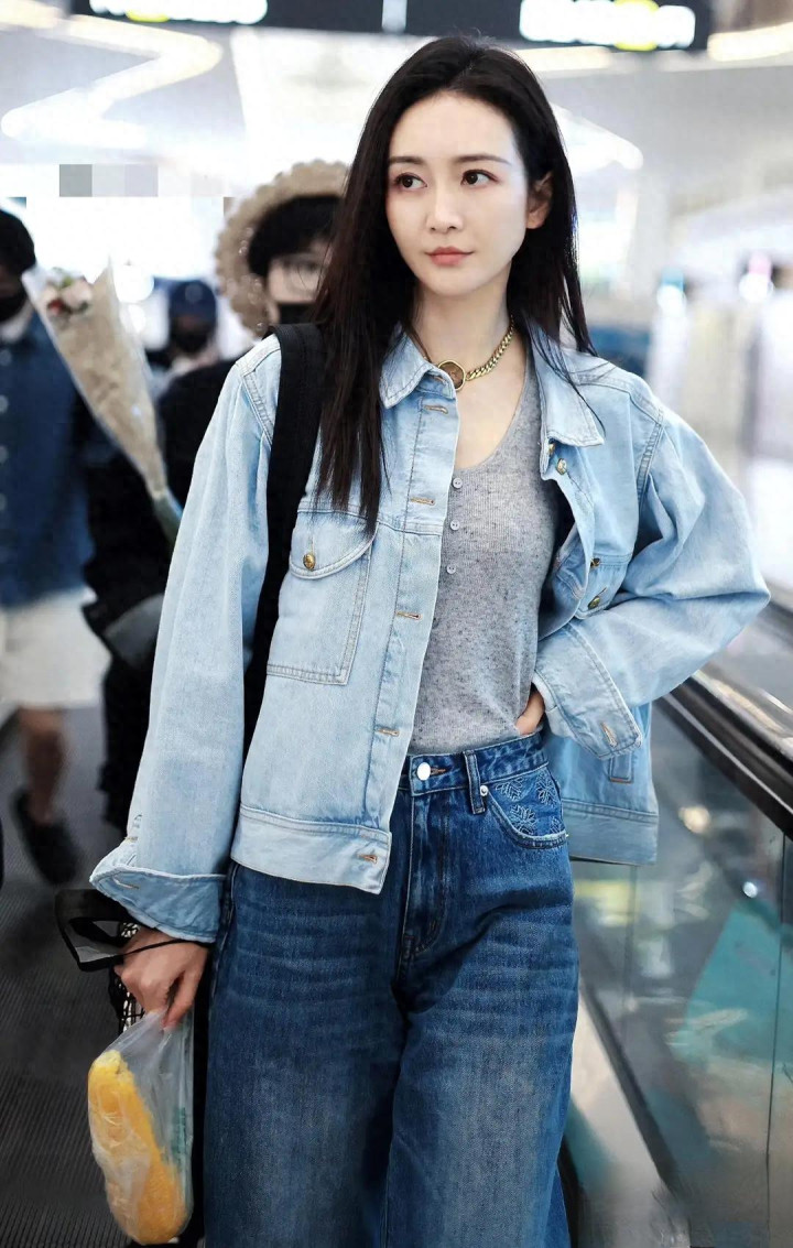 王鸥机场时尚, 牛仔外套配阔腿裤, 舒适随性又时尚